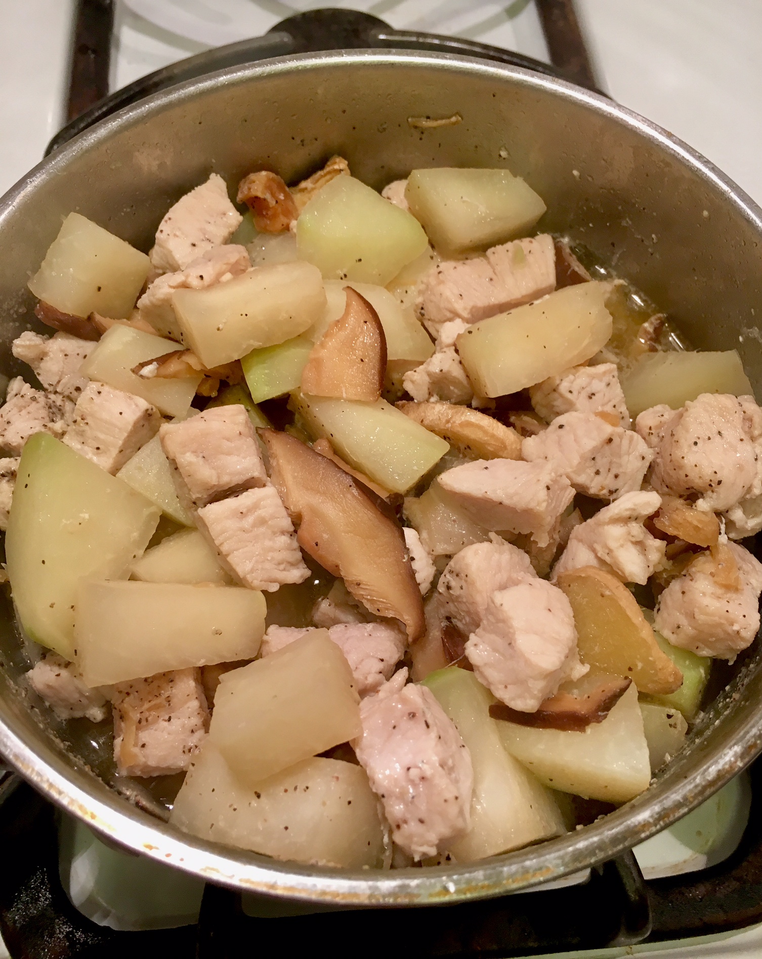 This week Kohlrabi was ready to harvest at my community farm in Red Hook, Brooklyn. I’m always excited by the challenge of cooking something that’s in season yet off-the-beaten-track of my usual repertoire. I harvested a few and took them home to give it a go. Thinking through Chinese ingredients, I wanted to meld “soft” flavors into the kohlrabi dish. I also wanted to add a meat protein to the dish for no other reason than to eat it as part of my meal. I chose turkey breasts cut into cubes. I could’ve easily excluded the turkey but I wasn’t planning to cook a separate meat dish for dinner.